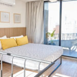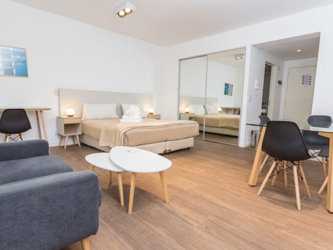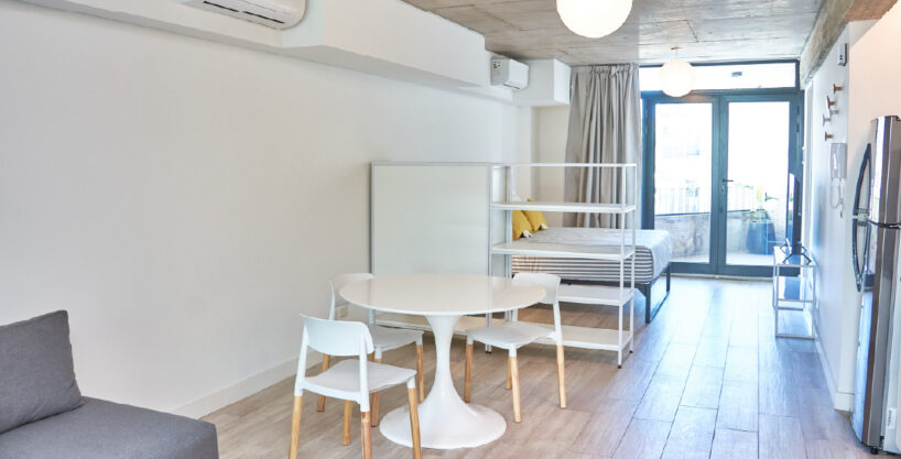 Este Studio A cuenta con un diseño contemporáneo y una distribución abierta que ofrece amplitud y luminosidad. Los ventanales, que ocupan toda la pared lateral, permiten que la luz natural inunde el espacio, creando un ambiente cálido y acogedor. Con acabados de alta calidad y un estilo «obra gris» que resalta la modernidad, este estudio es perfecto para quienes buscan un lugar práctico y sofisticado.